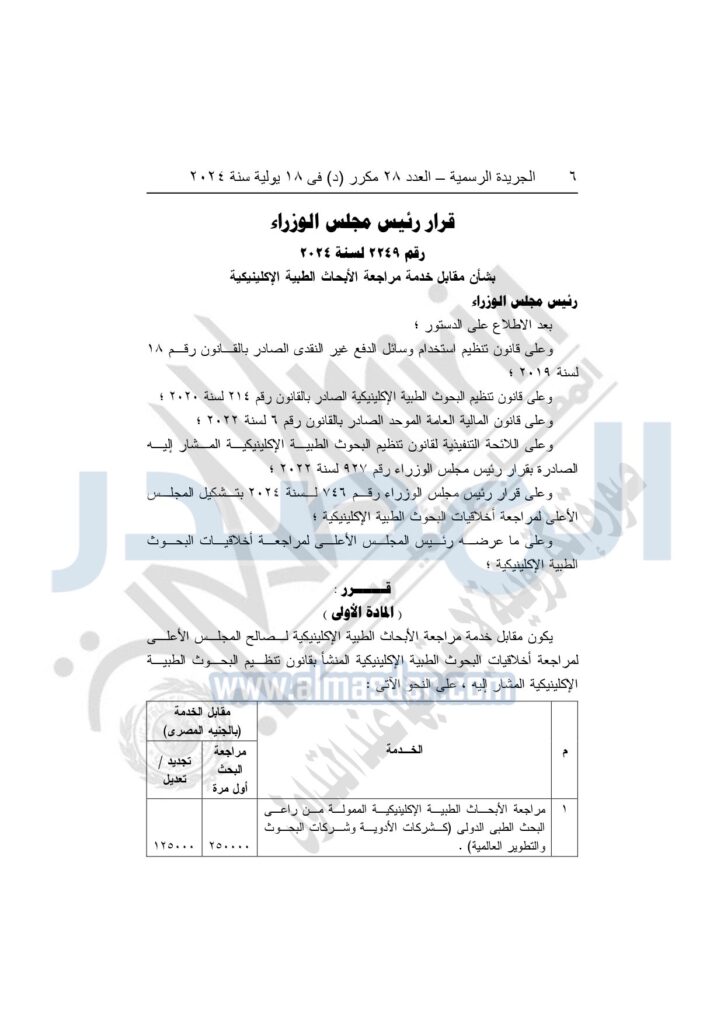 ونص القرار على «أن يكون مقابل خدمة مراجعة الأبحاث الطبية الإكلينيكية لصالح المجلس الأعلى لمراجعة أخلاقيات البحوث الطبية الإكلينيكية المنشأ بقانون تنظـيم البحـوث الطبيـة الإكلينيكية، وتبدأ مراجعة الأبحاث من 75 ألف جنيه، وحتى 250 ألف جنيه».