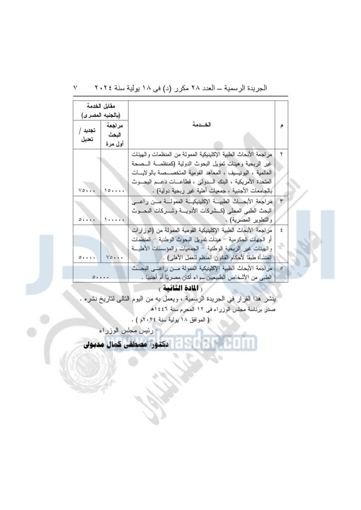 نشرت الجريدة الرسمية، اليوم الإثنين، في عددها رقم 28 مكرر (د) قرارًا للدكتور مصطفى مدبولي، رئيس مجلس الوزراء، الذي يحمل رقم 2249 لسنة 2024، بشأن مقابل مراجعة الأبحاث الطبية الإكلينيكة.