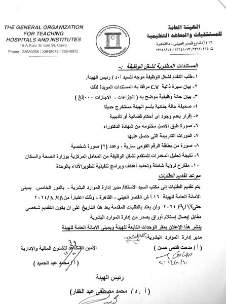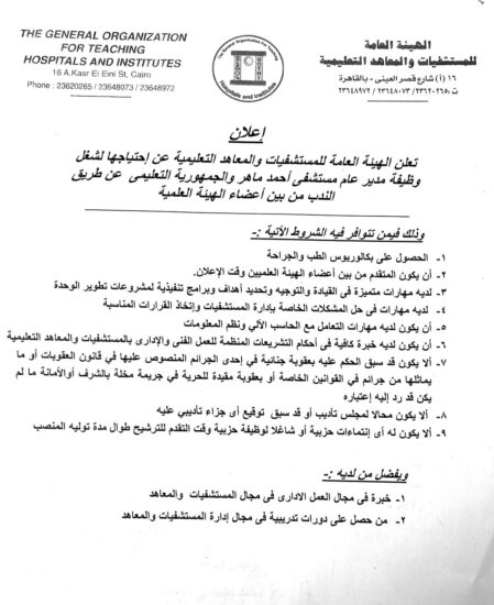 أعلنت الهيئة العامة للمستشفيات التعليمية عن حاجتها لشغل شغل وظيفة مدير عام كلًا من مستشفى أحمد ماهر ومستشفى الجمهورية التعليمي.