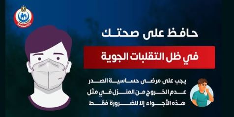 وأوضحت الوزارة أن على المرضى المصابين بحساسية الصدر تقليل الخروج من المنزل إلا للضرورة القصوى، وضرورة ارتداء الكمامة أثناء الخروج لتفادي دخول الهواء الملوث إلى الشعب الهوائية، خاصة في أوقات العواصف الترابية.