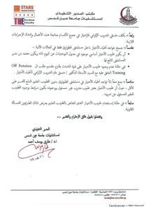 رابعاً:- يكلف منسقي التدريب الإلزامي للإمتياز في جميع الأقسام بمتابعة هذه الأعمال وإتخاذ الإجراءات اللازمة.