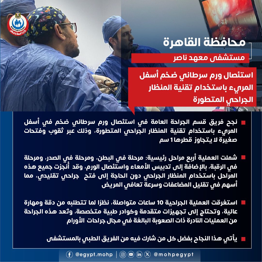 استئصال ورم سرطاني ضخم أسفل المريء باستخدام تقنية المنظار الجراحي المتطورة بمستشفى معهد ناصر