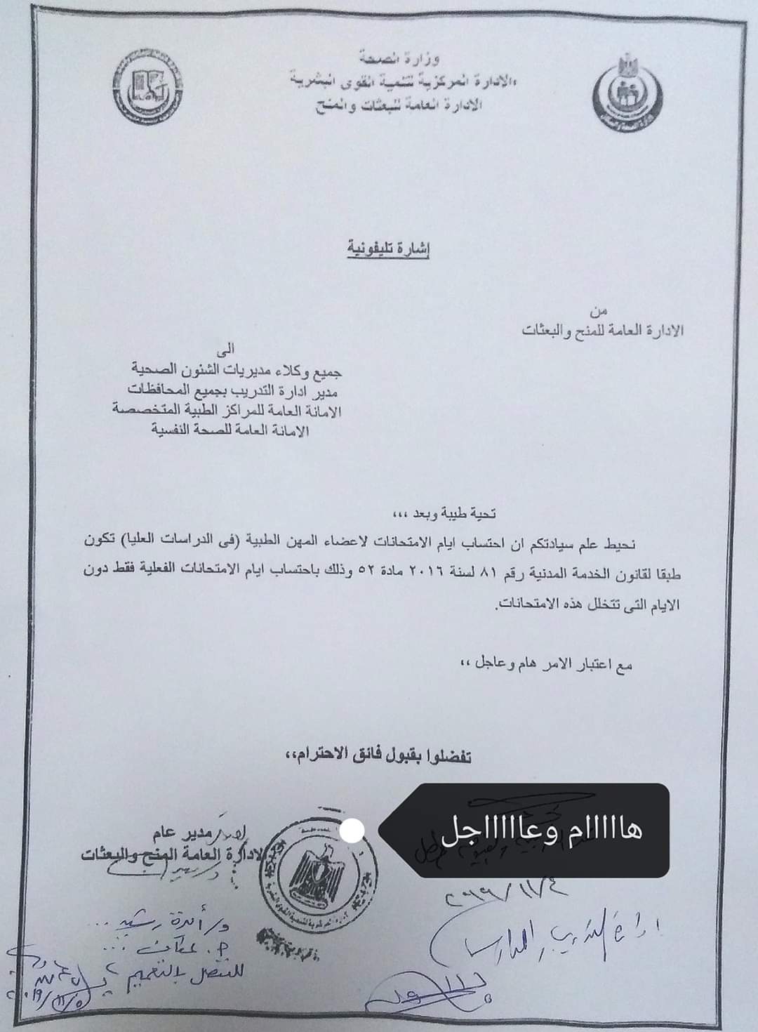 أرسلت ادارة المنح والبعثات بوزارة الصحة إشارة إلى جميع وكلاء وزارة الصحة بالمحافظات، ورؤساء الهيئات التابعة للوزارة، تتضمن تعليمات هامة بشأن اجازة امتحانات الدراسات العليا لأعضاء المهن الطبية.