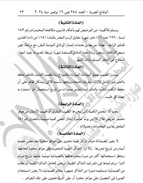 يسلم للأطباء من المرخص لهم بأحكام قانون مكافحة المخدرات رقم 182 لسنة 1960 عدد “1” دفتر شهريًا مقابل الرسم المقدر بالمادة “15” من ذات القانون للدفتر الواحد، فضلًا عن مقابل خدمات إصدار الوثائق المؤمنة المقرر مع مراعاة تغير سعر التكلفة، ويجوز زيادة عدد الدفاتر المسلمة شهريًا شريطة تقديم ما يفيد انتهاء النماذج في الدفتر المسلم بذات الشهر.