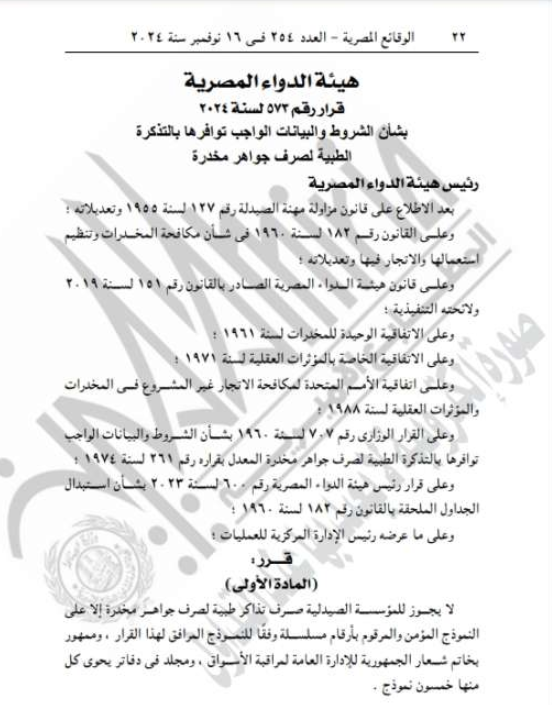 أصدر رئيس هيئة الدواء المصرية د. علي الغمراوي، قرار رقم 573 لسنة 2024، بشأن الشروط والبيانات الواجب توافرها بالتذكرة الطبية لصرف الجواهر المخدرة.