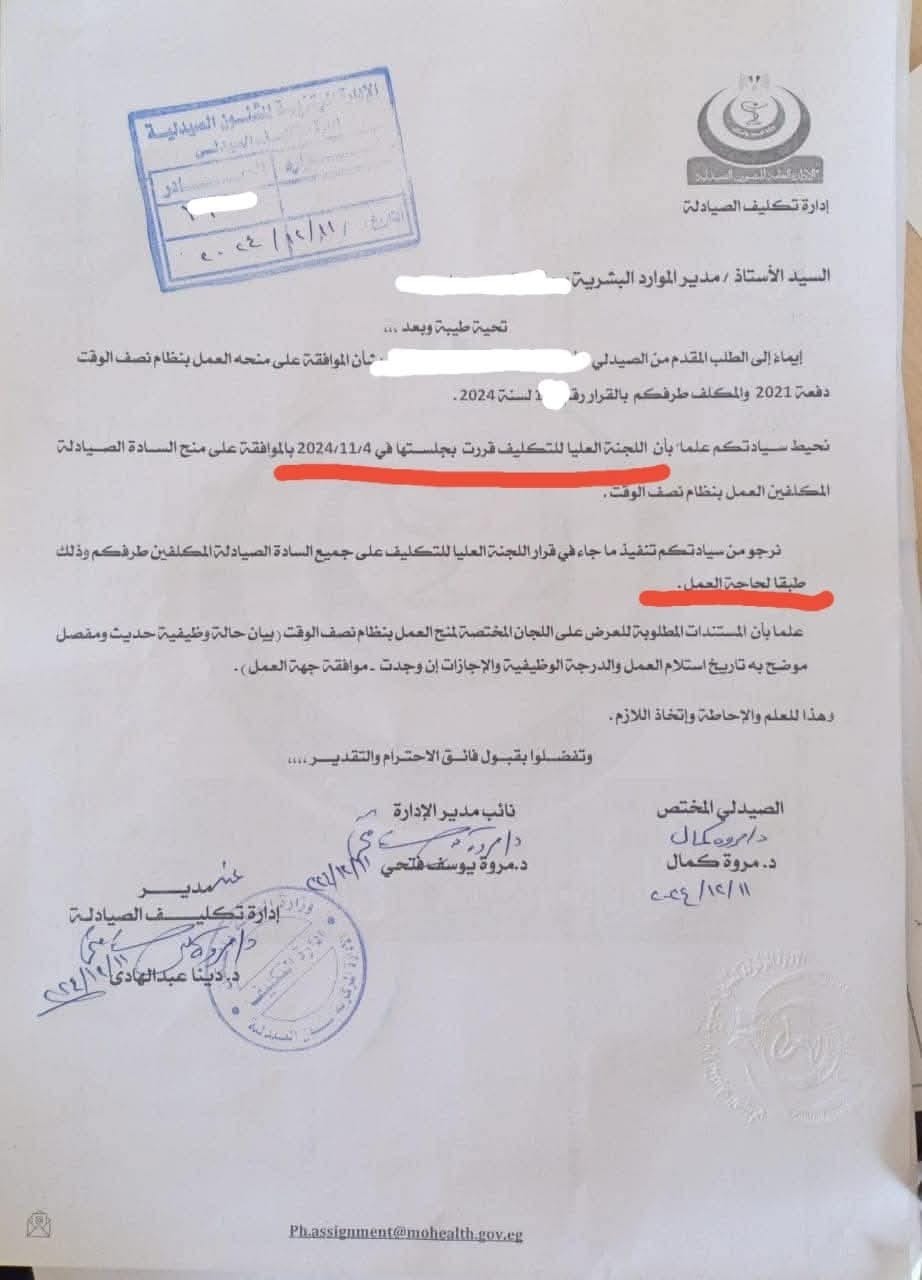 وأرسلت إدارة تكليف الصيادلة بوزارة الصحة، خطابًا، نص على أن اللجنة لإدارة التكليف قررت الموافقة على منح الصيادلة المكلفين العمل بنظام نصف الوقت، وذلك بعد طلب تم تقديمه من أحد أطباء دفعة 2021 لمنحه الموافقة على نظام العمل بنصف الوقت.
