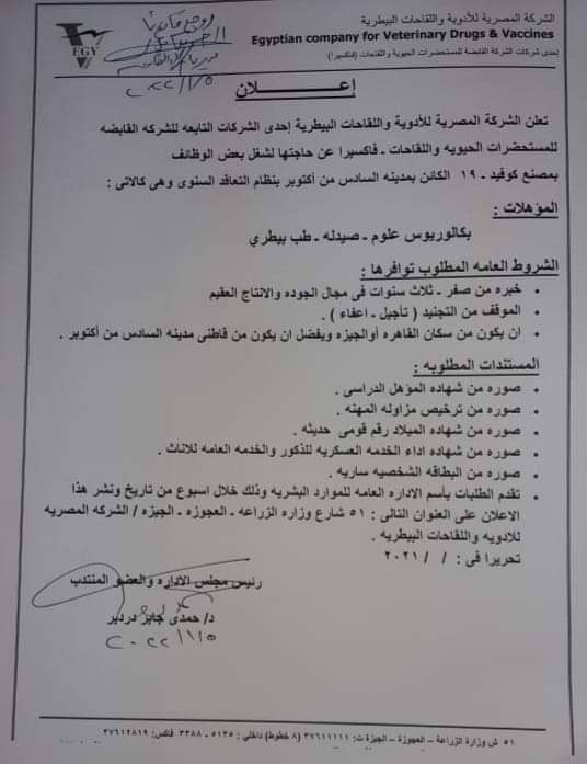 أعلنت الشركة المصرية للأدوية واللقاحات البيطرية التابعة للشركة القابضة للمستحضرات الحيوية واللقاحات فاكسيرا عن حاجتها لشغل بعض الوظائف بمصنعها الجديد لإنتاج لقاح مصري لعلاج فيروس كورونا.