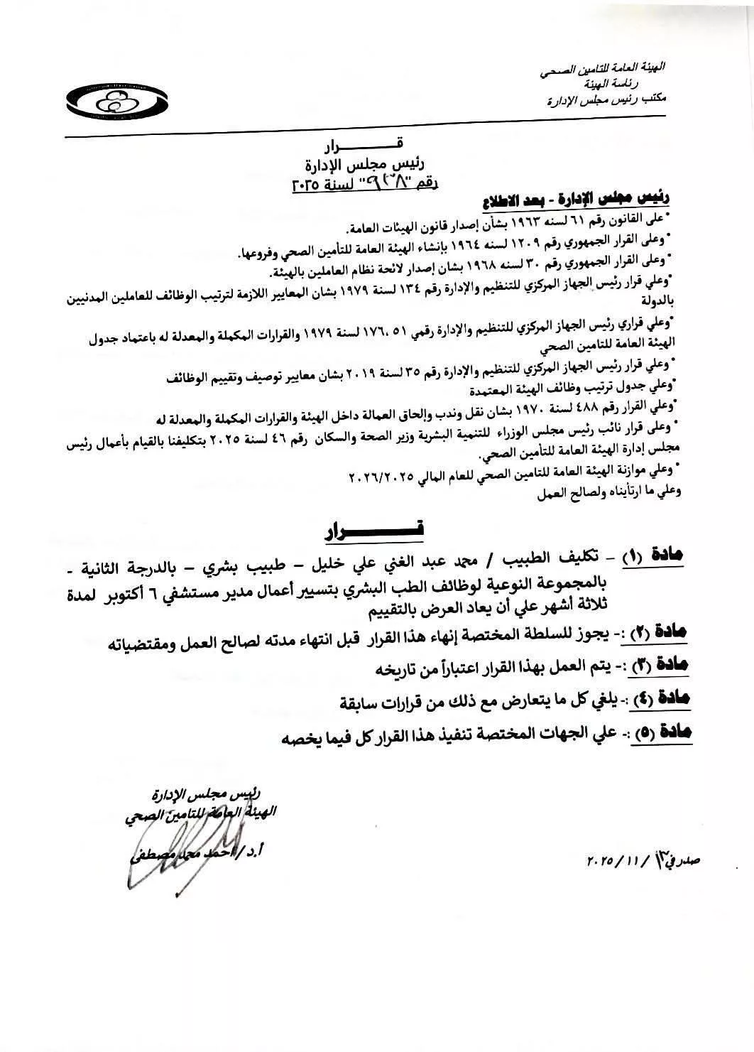 ونص القرار رقم 938 لسنة 2025، على تكليف الدكتور محمد عبد الغني علي، طبيب بشري بالدرجة الثانية بالمجموعة النوعية لوظائف الطب البشري، بتسيير أعمال مدير مستشفى 6 أكتوبر لمدة 3 أشهر، على أن يعاد العرض بالتقييم.