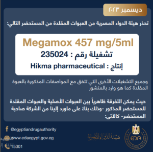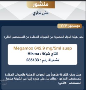 وأصدرت الهيئة منشور تحذيري، أوضحت فيه أن العبوات المغشوشة لميجاموكس شراب تركيز 642 مجم تحمل تشغيلة رقم 235133، والعبوات المغشوشة لميجاموكس شراب تركيز و457 مجم تحمل تشغيلة رقم 235024.