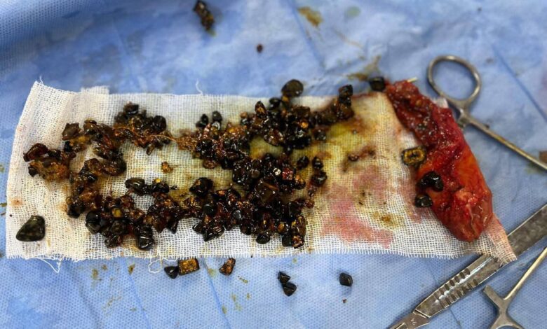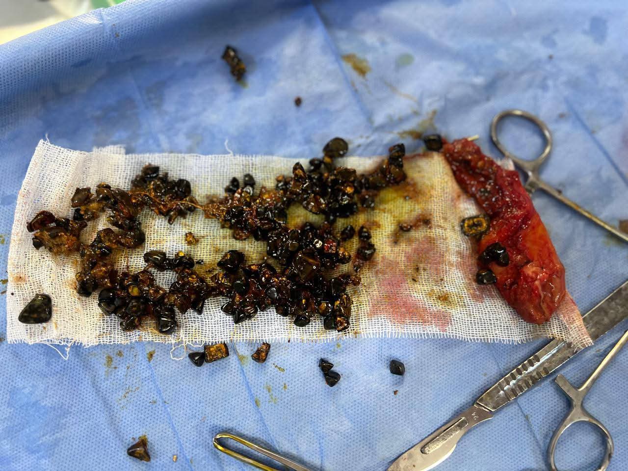 وخلال العملية بدأ فريق الجهاز الهضمي بإجراء منظار القنوات المرارية الذي كشف عن وجود حصوة بالقناة الرئيسية، وتم استخراجها بنجاح وتوسيع القناة، ثم استكمل فريق الجراحة التدخل بإجراء استئصال المرارة بالمنظار الجراحي، قبل نقل المريضة إلى الإفاقة ثم القسم الداخلي حيث استقرت حالتها تمامًا.