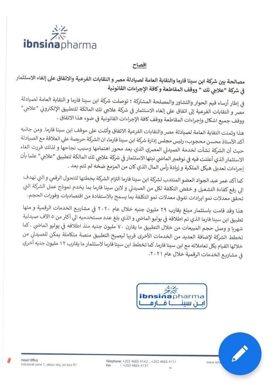 وقالت الشركة فى افصاح -بيان – للبورصة صباح اليوم الاثنين، أنها توصلت لاتفاق مع نقابة الصيادلة، وإلغاء الاستثمار فى شركة علاجى المالكة لتطبيق علاجى، ووقف كافة الاجراءات القانونية فى هذا الشأن، وأن نقابة الصيادلة ثمنت هذه الخطوة من جانب شركة ابن سينا فارما.