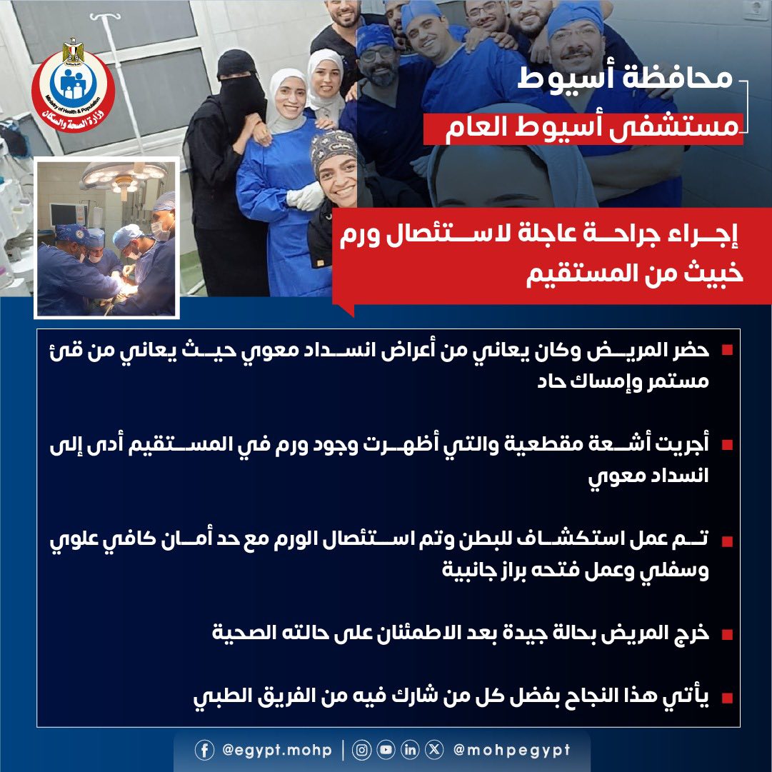 أعلن فريق الجراحة بمستشفى أسيوط العام عن نجاح عملية جراحية دقيقة لاستئصال ورم خبيث في المستقيم، وذلك بعد استقبال مريض كان يعاني من أعراض انسداد معوي حاد تمثلت في قيء مستمر وإمساك شديد.