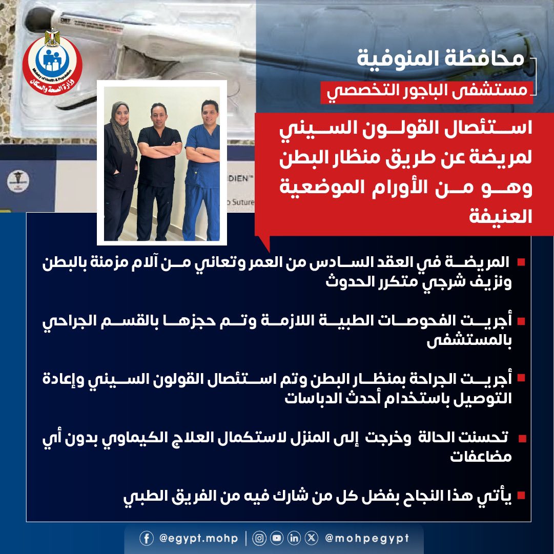 سجّل فريق الجراحة العامة بمستشفى الباجور التخصصي بمحافظة المنوفية إنجازًا طبيًا مميزًا، بعد نجاحه في إجراء عملية استئصال القولون السيني لمريضة في العقد السادس من عمرها باستخدام منظار البطن الجراحي، وذلك للتعامل مع ورم موضعي عنيف.