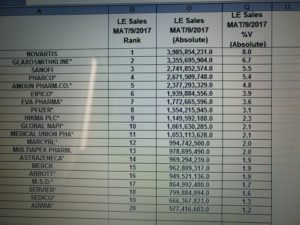 أظهر تقرير تقرير مؤسسة «IMS» العالمية للمعلومات الدوائية، الصادر عن سوق الدواء المصرى للفترة بين شهر 9 / 2016 وحتى نهاية 9 / 2017، احتفاظ شركة نوفارتس السويسرية بالمركز الأول من حيث حجم المبيعات، وتأخر شركة ايبيكو للمركز السادس بعد أن كانت فى المركز الخامس خلال عام 2016.