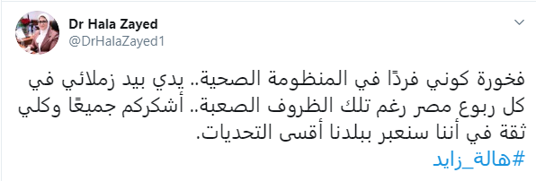 وكتبت زايد، عبر تويتر:”فخورة كوني فردا فى المنظومة الصحية.. يدى بيد زملائى في كل ربوع مصر رغم تلك الظروف الصعبة.. أشكركم جميعًا وكلى ثقة فى أننا سنعبر ببلدنا أقسى التحديات”.