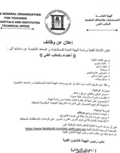 وظائف شاغرة للأطباء والصيادلة والعلاج الطبيعي طلبتها الأمانة الفنية برئاسة الهيئة العامة للمستشفيات والمعاهد التعليمية.