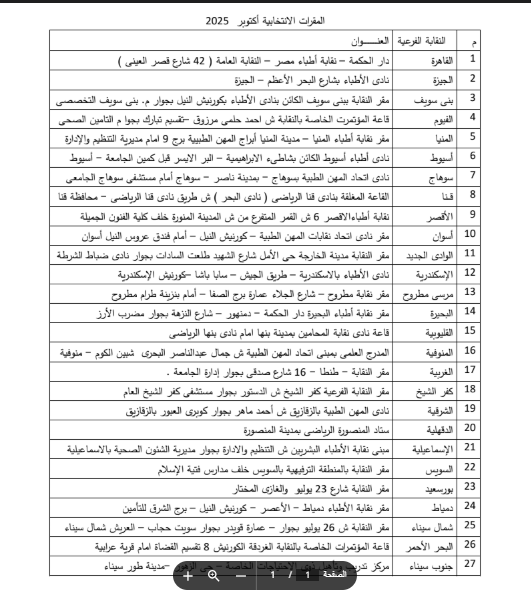 27 مقرًا انتخابيًا بانتخابات التجديد النصفي للأطباء.. (تعرف عليها)