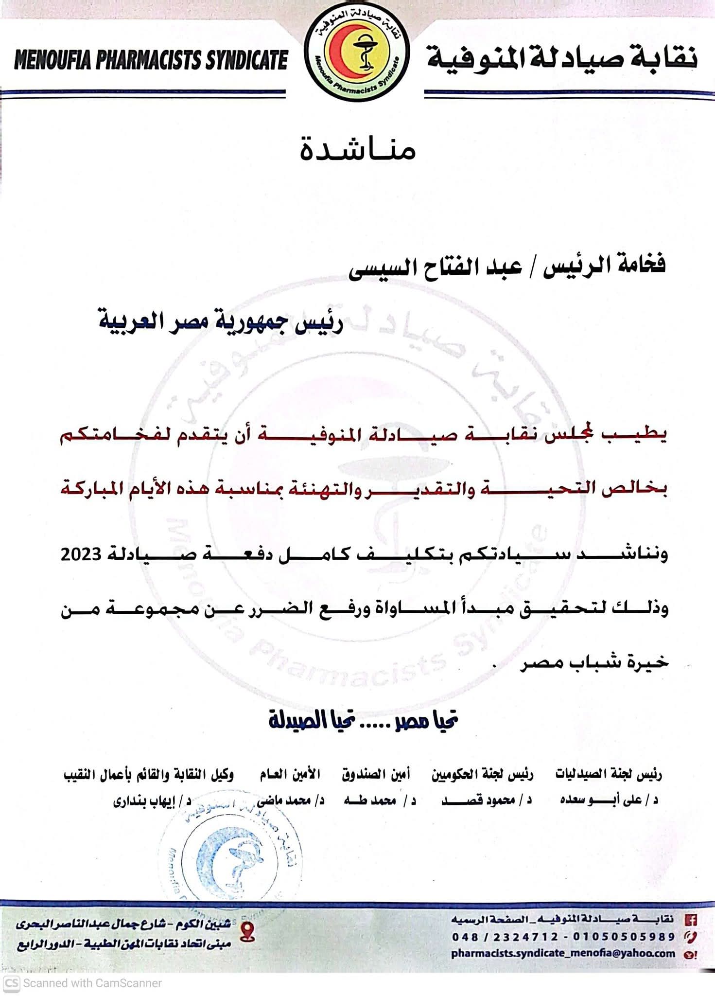 كما طالبت نقابة صيادلة المنوفية من الرئيس السيسي بتكليف كامل دفعة صيادلة 2023 وذلك لتحقيق مبدأ المساواة ورفع الضرر عن مجموعة من خيرة شباب مصر .